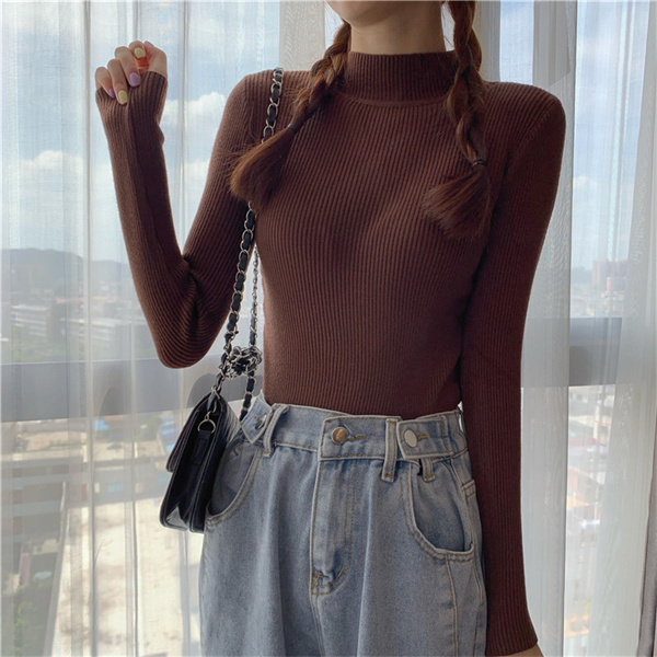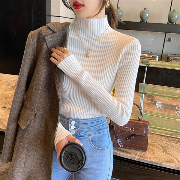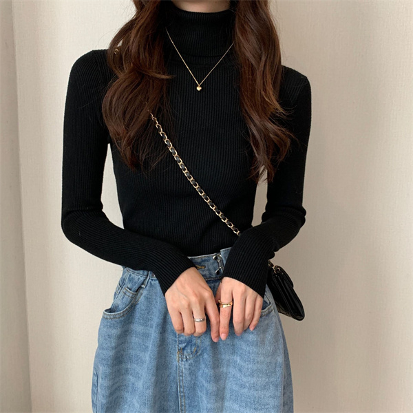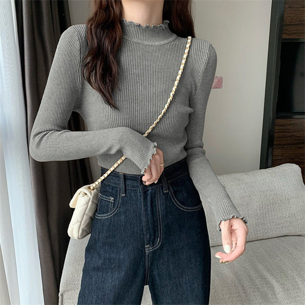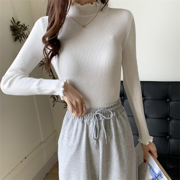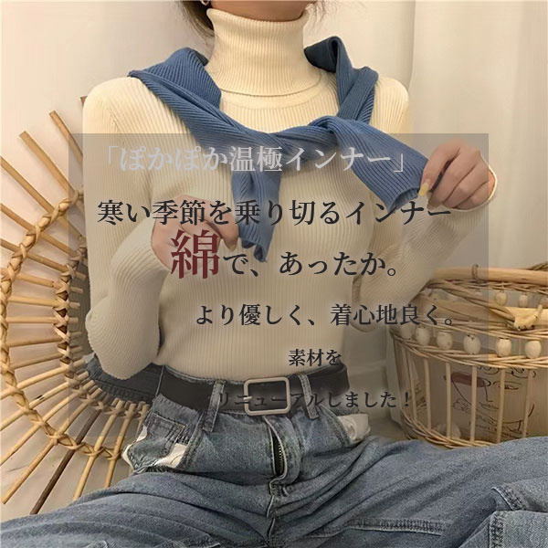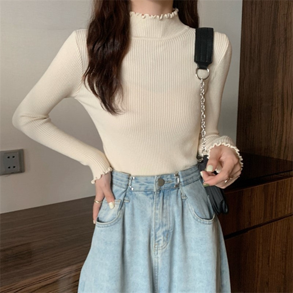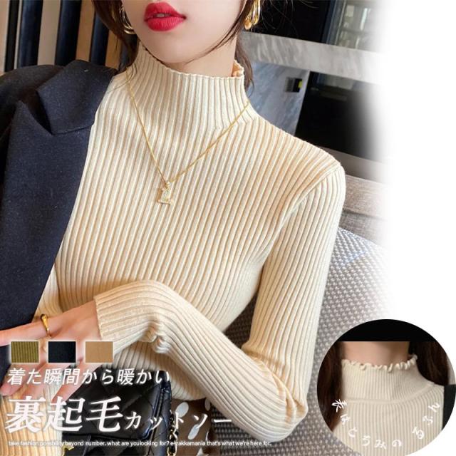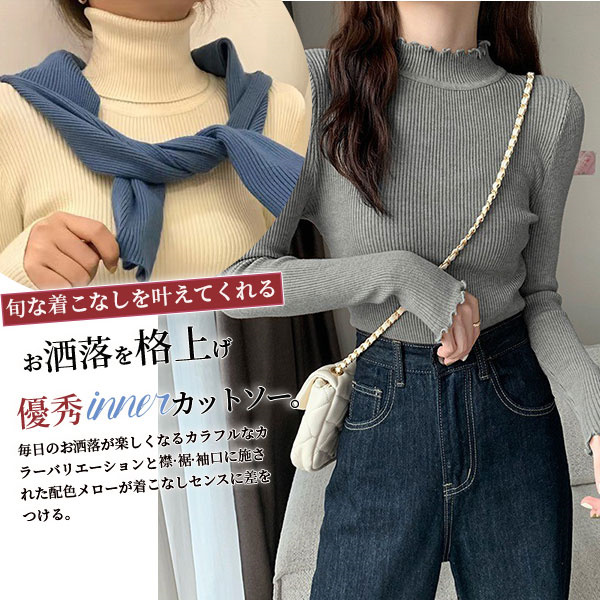 人気急上昇 リブカットソー レディース 長袖 セーター オフタートル インナー プルオーバー フリル 重ね着 無地 秋物 カジュアル 40代 きれいめ