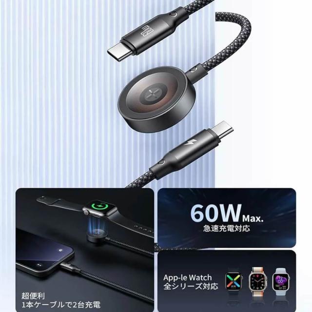 超便利、1本ケーブルで2台充電。60W Max.、急速充電対応。Apple Watch、全シリーズ対応。