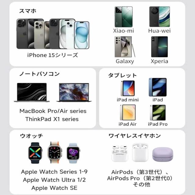 MacBook Pro/Air、iPad、iPhone 16/15シリーズ、Xperia/Galaxy/Pixel、Switch/Androidその他USB-C機器を対応します。