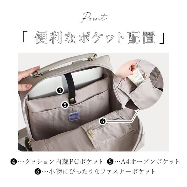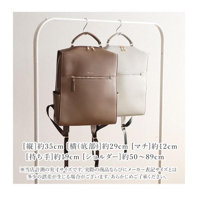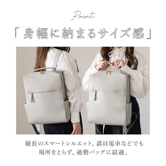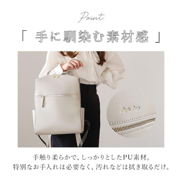| 商品説明 | 【いつものコーデがワンランクアップ】 ・優雅で上品な雰囲気をプラス♪「Legato Largo ブライトバッグリュック」。 【大人の魅力を引き立てるブライト】 ・働く女性をいきいきと輝かせてくれるシリーズ。程よい光沢感と華やかな金具使いがポイント。 【人混みでも邪魔にならないフォルム】 ・縦長のスマートシルエット。満員電車などでも場所をとらず、通勤バッグに最適。 【ガバっと開くダブルファスナー】 ・左右どちらからもオープン。中身を確認しやすく、荷物の出し入れがスムーズ。 【A4&13インチのPC対応で便利】 ・A4がすっぽり、13インチのPCが収納できるクッションポケット付き!PCを楽々持ち歩き◎ (※)対応サイズは目安です。 【サクッと取り出せて迷子知らず】 ・クッションポケットの他にも、5つのポケットを配置。バッグの中で、小物を探す手間が不要。 【面倒なお手入れいらずで手軽に】 ・手触り柔らかなPU素材。特別なお手入れは必要なく、汚れなどは拭き取るだけ。 【手持ちもしやすいハンドル付き】 ・トート風に持ってもOK。電車やバスの中などで下ろすシーンでも重宝。 【飽きが来ず長く愛用できるアイテム】 ・トレンドに左右されず、オールシーズン使える☆コーデに馴染むシンプルデザイン。 【ポケット仕様】 ・内側:スナップボタンベルト付きクッションポケット×1、オープンポケット×1、ファスナーポケット×1 ・前面:ファスナーポケット×1 ・サイド:オープンポケット×2 |