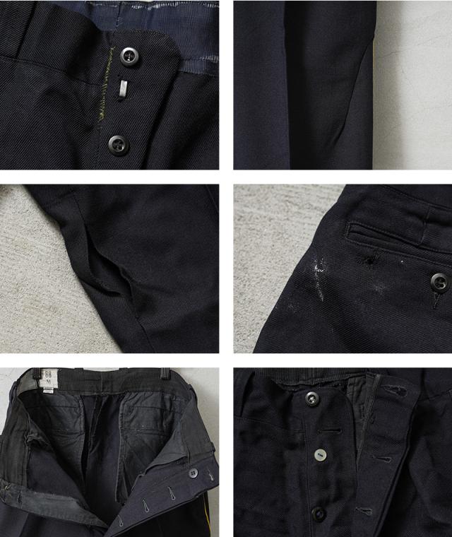 | 商品説明 | リジェクト 訳あり品 実物 USED フランス軍 ALPINE HUNTER イエロー サイドライン ワンタック ウール トラウザーズのご紹介です。 フランス軍の山岳戦闘を専門とするフランス陸軍の精鋭部隊の一つであるALPINE HUNTER(アルパインハンター)が軍事パレードや式典等でも着用するウールトラウザーズです。 1970年代頃をメインとした様々な年代のアイテムが入荷しています。厚手のウールサージが使用されており、ネイビーのボディにサイドにはイエローのパイピングの挿し色がバランスの良いコントラストになっています。フロントはボタンフライやジッパーフライの仕様があり、バックポケットの数やデザインも様々です。 ウールサージはその耐久性と高級感からフランス軍でも多く使用されている素材で、ツイルの斜めに走る織り目が特徴です。この織り方により、生地にしなやかさと強度が加わります。表面が滑らかでありながらウール特有のドライな質感があり、ツイルの構造により、シワがつきにくく機能性と上品さを併せ持った素材です。 両サイドには使い勝手の良いスラッシュポケット、フロントにはタックまたはダーツが入り、ヒップ周りに適度なゆとりを持たせ、裾にかけてわずかにテーパードしたシルエットが特徴です。 サイドラインが入れられることで足長効果が期待できるほか、センタークリースが入ることで立体的なフォルムができ、クラシックなスラックスの表情で上質な雰囲気を感じさせます。レザーシューズやスニーカーに合わせるだけでフォーマルからカジュアルまで幅広いスタイルに対応可能で、いつもと違う雰囲気を出せるパンツです。 フランス軍の中でも困難な環境でも成果を上げるプロフェッショナル部隊が使用するトラウザーズは流通量が少なく、なかなか出回らない希少で洗練されたアイテムです。 こちらはリペアや破れ、汚れ、ボタンの欠損など不具合のある商品を選別しております。多少のリペアを施していただいてからの着用、もしくはリメイク資材としてもおすすめです。ファーストクオリティの品質を強くお求めの方は念の為ご購入をお控え願いますようお願い致します。 | |||||||||||||||||||||||||||||||||||||||||||