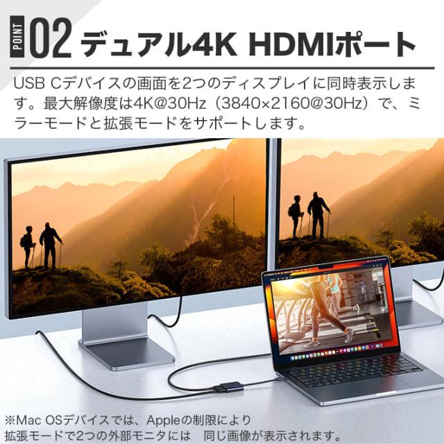 USB C デュアルHDMIアダプタは、USB Cデバイスの画面を2つのディスプレイに同時表示します。最大解像度は4K@30Hz(3840×2160@30Hz)で、ミラーモードと拡張モードをサポートします。小さな画面の圧迫感を軽減します。ただし、Mac OSデバイスでは、Appleの制限により拡張モードで2つの外部モニタには同じ画像が表示されます。