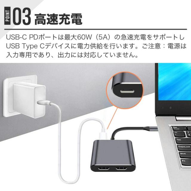 【USB C to 2 HDMI アダプタ】2つのHDMIポート、USB 2.0ポート、PD高速充電ポートをサポートするアダプタです。ソフトウェアやドライバのインストールは不要で、接続するだけで簡単に利用できます。この4つのポートが1つのアダプタで利用可能となり、高品質の画面出力、急速充電、データの高速伝送が同時に行えます。ただし、一部のAmazonや他のアプリの動画は著作権保護のため、映像出力に制限がある場合があります。ご了承ください。