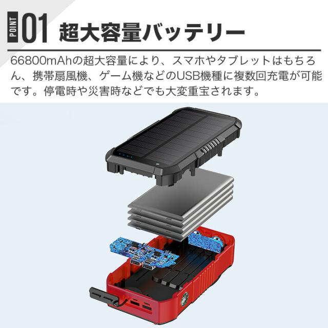 66800mAhの超大容量により、スマホやタブレットはもちろん、携帯扇風機、ゲーム機などのUSB機種に複数回充電が可能で、アウトドア活動や長期間の外出もバッテリー切れの心配はなく、停電時や災害時など電源が取れない状況でも大変重宝されます。