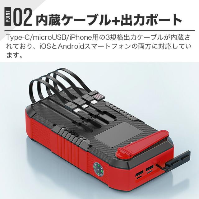 Type-C/microUSB/iPhone用の3規格出力ケーブルが内蔵されており、iOSとAndroidスマートフォン両方に対応しています。余計なケーブルを持ち運ぶ必要がありません。