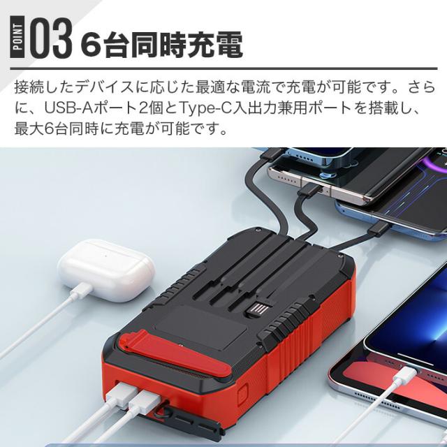 ソーラーモバイルバッテリー 大容量 66800mAh 22.5W/PD18W 急速充電 4本ケーブル内蔵 6台同時充電 手回し充電 蓄電