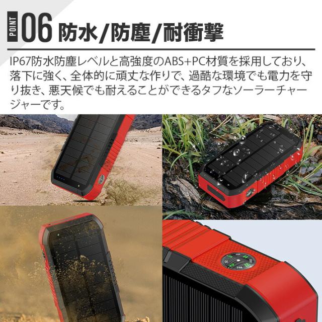 簡易なコンパスが付いており、アウトドアに最適な多機能充電器です。IP67防水防塵レベルと高強度のABS+PC材質を採用しており、落下に強く、全体的に頑丈な作りで、過酷な環境でも電力を守り抜き、悪天候でも耐えることができるタフなソーラーチャージャーです。アウトドア用や防災用として一台あれば心強いです。