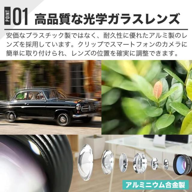 優れた光透過性と高解像度のレンズにより、画質劣化の原因となる収差を低減し、画面全体で高画質な描写を実現します。安価なプラスチック製ではなく、耐久性に優れたアルミ製のレンズを採用しています。クリップでスマートフォンのカメラに簡単に取り付けられ、レンズの位置を確実に調整できます。スマートフォンを専門的なカメラとして使用でき、よりプロフェッショナルな写真を撮影し、高品質な画像効果を楽しむことができます。