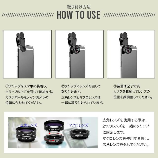 広角レンズとマクロレンズは一緒に取り付けられています。広角レンズを使用する際は、2つのレンズを一緒にクリップに固定します。マクロレンズを使用する際は、広角レンズを外してください。