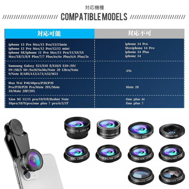 10in1 スマホ用カメラレンズ スマホ用撮影セット 広角/マクロ/魚眼/望遠/CPL/万華鏡/星形/フローフィルター/ラジアルレンズ ポーチ クリップ式交換レンズ 取付簡単