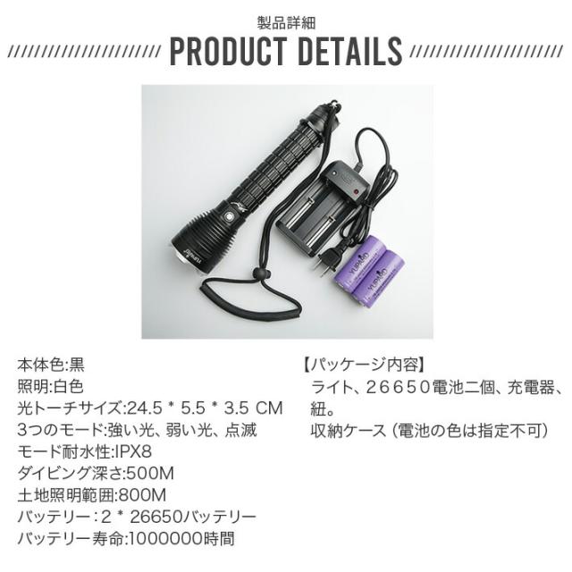 ポイント3倍 LED 懐中電灯 防水 最強6000ルーメン 超強力 XHP70LED 3モード 500m照明26650電池二個付