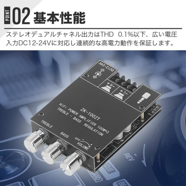基本性能:ステレオデュアルチャネル出力は、THD 0.1%以下、広い電圧入力DC12-24Vに対応し、連続的な高電力動作を保証します。