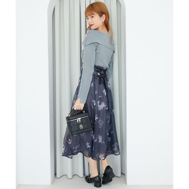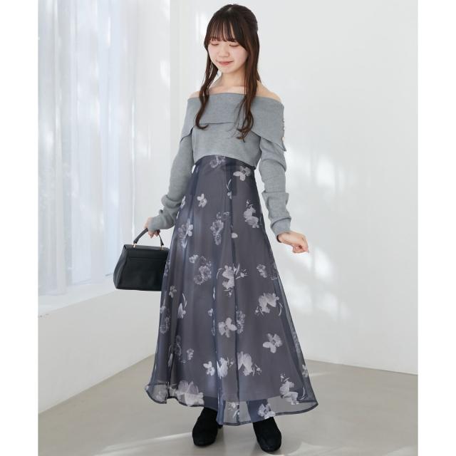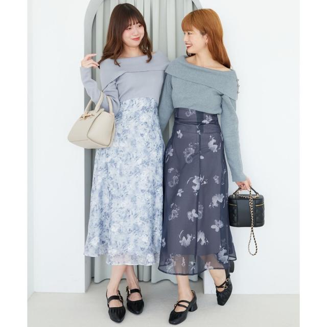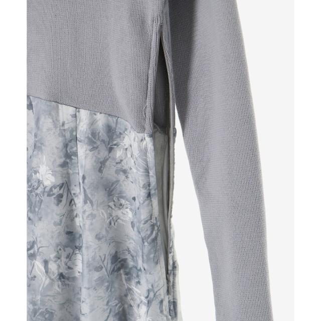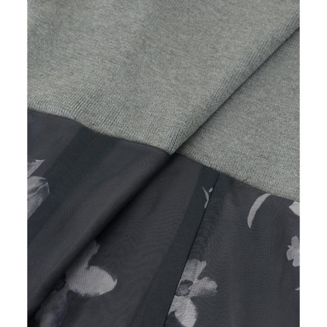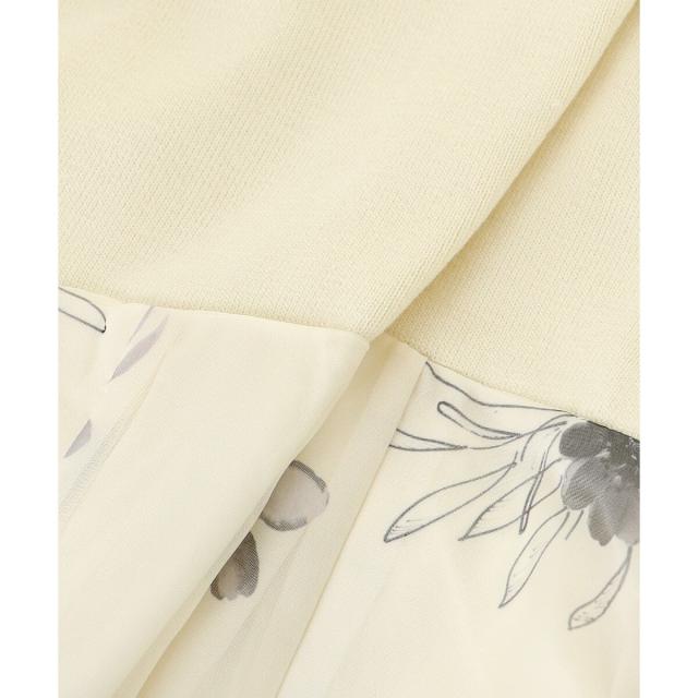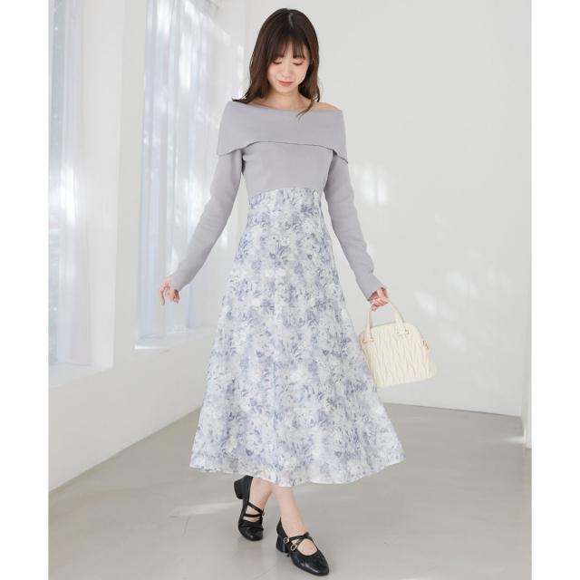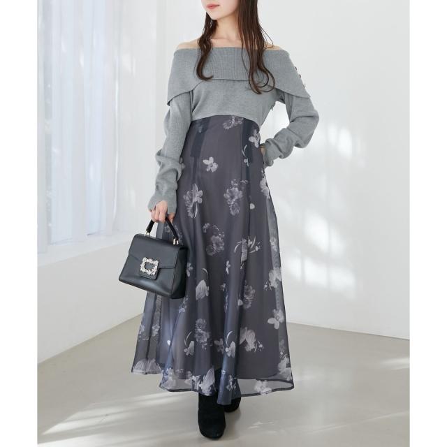 ハイゲージニットの身頃と軽い布帛のスカートをドッキングさせた、メリハリのあるデザインが女性らしさを惹きたてます。