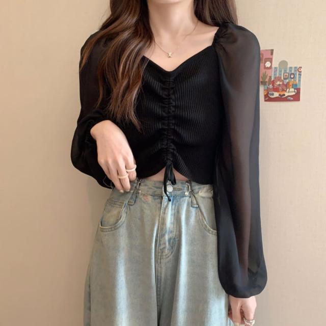 シフォン袖×リブニット素材のMIXデザインでフェミニンな印象を与えてくれるニットトップス
