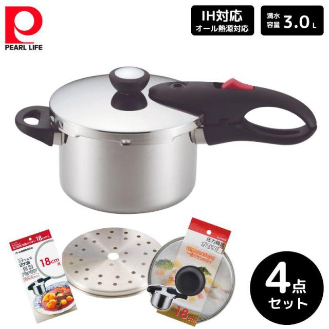 パール金属 軽量単層NEO 片手圧力鍋3.0L 4点セット 18mm 蒸し目皿 ガラス蓋 交換パッキン ステンレス 料理 ギフト 新生活