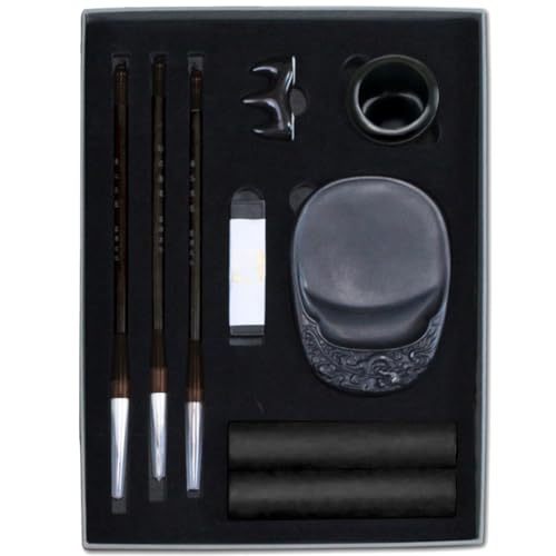 筆・硯・墨・水鉢・筆置き・文鎮がセットになっています。 書道に必要な文房四宝(筆、硯、墨、紙)の中、紙以外が揃っています。 セット内容:筆 3本(太1本,中2本)/ 硯 1個 / 墨 1本 / 文鎮 2本 / 筆置き 1個 / 水皿 1個 収納ケースサイズ:27×37.2×5cm