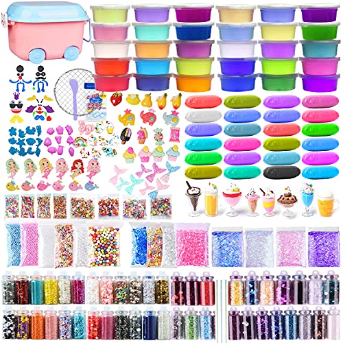 スライム キット 水晶粘土 DIY セット おもちゃ 手作りツール 金魚鉢ビーズ 果物切片 カラフルフォーム紙吹雪 含有54個入りふわふわクリスタル粘土 slime 6歳以上