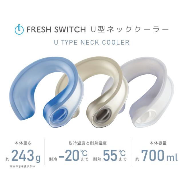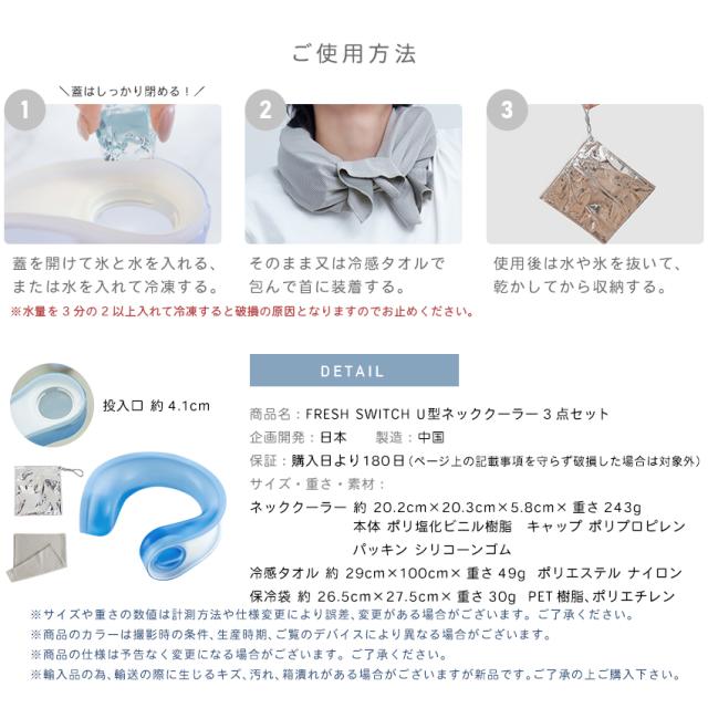 | 【DETAIL】 商品名:FRESH SWITCH U型ネッククーラー 3点セット 企画開発:日本 製造:中国 保証:購入日より180日(ページ上の記載事項を守らず破損した場合は対象外) サイズ・重量・素材:ネッククーラー:約20.2cm × 20.3cm × 5.8cm、重量 243g 本体:PVC キャップ:PP パッキン:PA 冷感タオル:約29cm × 100cm、重量 49g ポリエステル、ナイロン 保冷袋:サイズ:約26.5×27.5cm、重量:約30g、素材:PET樹脂、ポリエチレン |