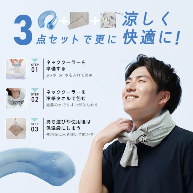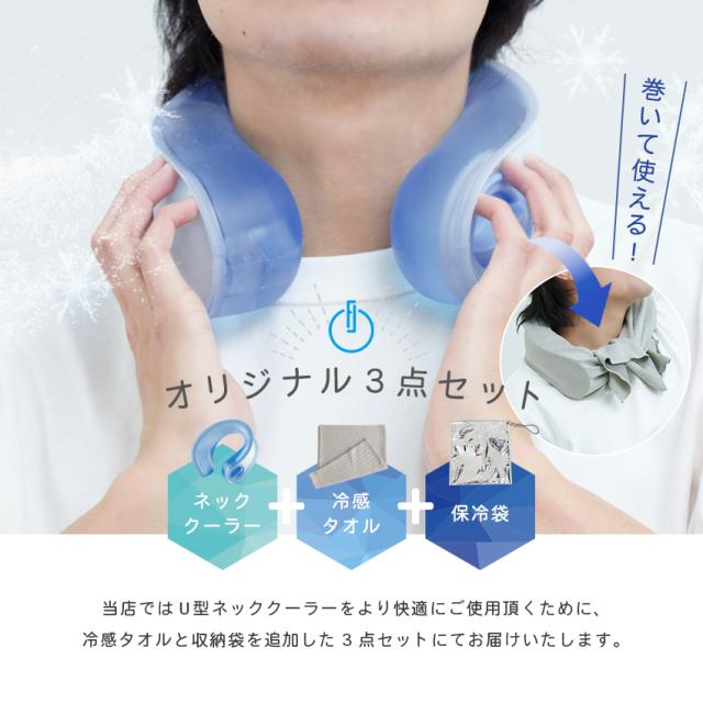 当店ではU字型ネッククーラーをより快適にご使用頂くために、冷感タオルと保冷袋を追加したオリジナル3点セットにてお届け♪