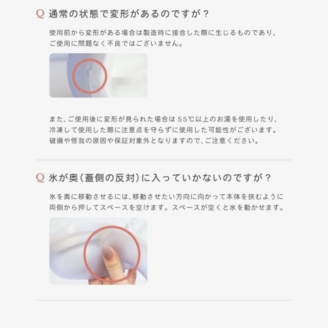 | 使い方は簡単! ・氷と水を入れる場合:比率は氷6:水4が効果的。 ・水を入れて冷凍する場合:水量は全体の80%まで。 |