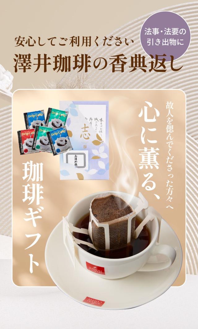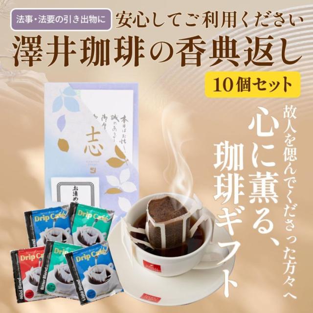 澤井珈琲 香典返し コーヒー ギフト ドリップコーヒー マイルド/ライト/ビターブレンド 3種 計5袋 10個セット (香典返し専用 挨拶状ハガキ 熨斗 手提げ袋 無料)品物 お返し 返礼品 引き出物 四十九日 満中陰志 忌明け 志 偲草 法事 法要 粗供養 粗品