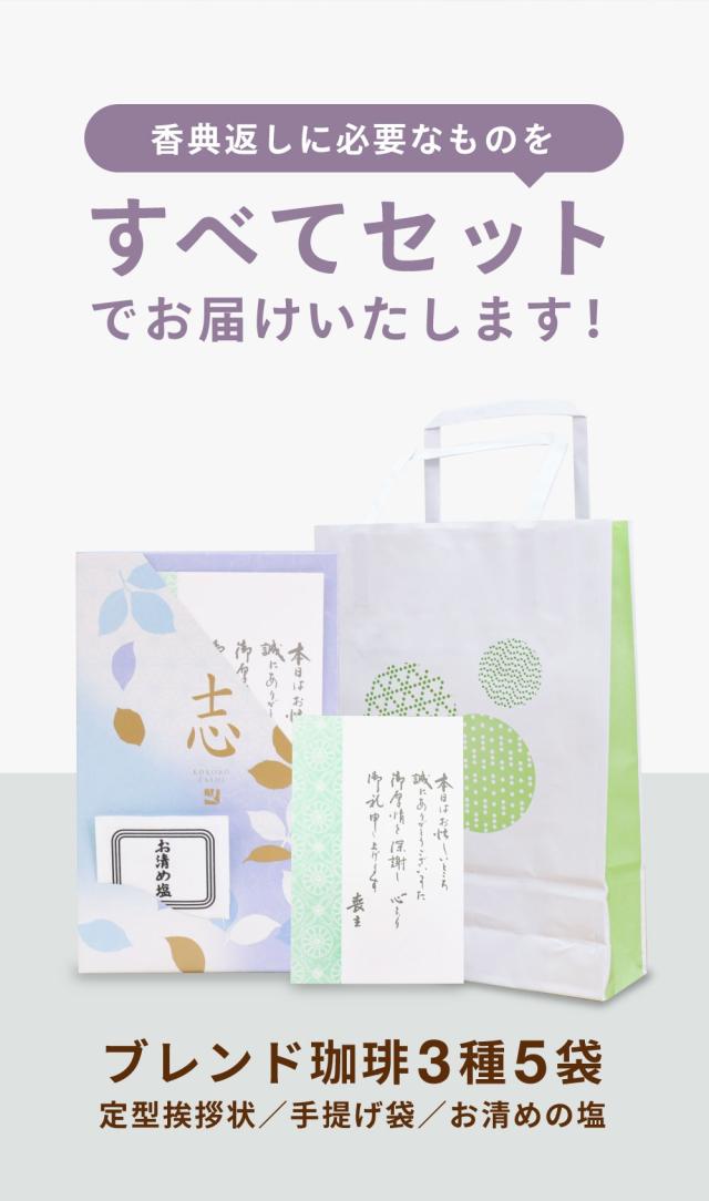 人気のブレンドコーヒー3種と挨拶状、お清めの塩、手提げ袋が含まれ、受け取った方にご負担をかけず、心を込めたご挨拶ができる内容になっています。