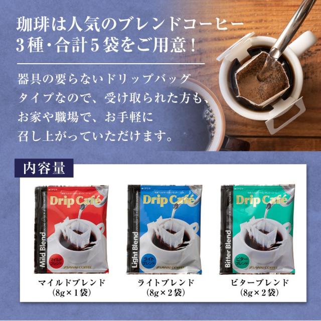セットのコーヒーは全てドリップバッグで、器具を使わず簡単に香り高いコーヒーを味わえる内容となっております。