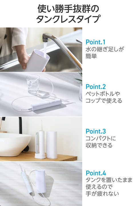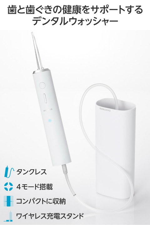 いつでもどこでもキレイを保ち、キレイな歯に。勢いのあるパルスジェット水流で食べカスや汚れを除去し、歯と歯ぐきの健康をサポートするデンタルウォッシャーです。衛生的に使えて持ち運びにも便利な小型・軽量のタンクレスタイプ。置くだけで手軽に充電できるワイヤレス充電スタンド付きです。