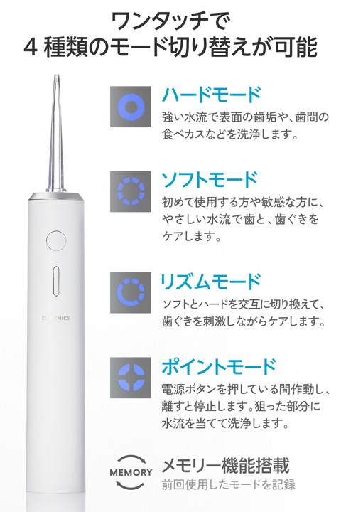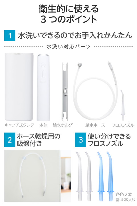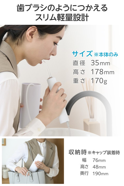 いつでもどこでもキレイを保ち、キレイな歯に。勢いのあるパルスジェット水流で食べカスや汚れを除去し、歯と歯ぐきの健康をサポートするデンタルウォッシャーです。衛生的に使えて持ち運びにも便利な小型・軽量のタンクレスタイプ。置くだけで手軽に充電できるワイヤレス充電スタンド付きです。![]() ■勢いのあるパルスジェット水流で食べカスや汚れを除去し、歯と歯ぐきの健康をサポートするデンタルウォッシャーです。衛生的に使えて小型・軽量のタンクレスタイプ。 ■水の力で口内の磨き残しを洗浄。毎分1200回のパルスジェット水流は、4種類のモードを選んで使えます。勢いやリズムを調整しながら好みに合わせてお手入れ可能です。 ■ハードモード:強い水流で表面の歯垢や歯間の食べカスなどを洗浄します。 ■ソフトモード:初めて使用する方や歯ぐきの感覚が敏感な方に。やさしい水流で歯と歯ぐきをケアします。 ■リズムモード:ソフトとハードを交互に切り替えて歯ぐきを刺激しながらケアします。 ■ポイントモード:電源ボタンを押している間作動し、離すと停止します。タイミングを自分でコントロールし、歯ぐきの歯周ポケットや矯正器具の付け根など狙った部分に水流を当てて洗浄できます。 ■※表面に付着している歯垢は、水流だけでは除去できないため、必ず歯磨きが必要です。歯磨き後に、本製品で口腔内を洗浄することをおすすめします。 ■複数人の被験者を対象とした実証テストの結果、ブラッシングだけでは歯垢の除去率は約43%ですが、本製品を併用すると一度の使用で70%以上の歯垢を除去できることが分かりました。継続使用することで、より高い効果が期待できます。 ※国内第三者検証機関での検証結果による。プラーク(歯垢)付着率(4分割PCR法)相対値。 ■※エレコムの実証テストでは、歯の模型やシャーレ上の培養歯垢ではなく、被験者の歯による「実際の使用環境での効果」を重視しています。 ■軽く持ちやすいタンクレスタイプです。タンク一体型と異なり水の継ぎ足しも簡単で、タンクの丸洗いが可能。衛生的でストレスフリーに使えます。 ■収納用のキャップを大型タンクとして利用でき、そこからホースで給水します。コップやペットボトルなどをタンクとして使うことも可能です。 ■直径35mm、重さ170gのスリム軽量設計。歯ブラシのように動かしやすいから、口内のすみずみまで洗浄できます。 ■置くだけで手軽に充電できる、ワイヤレス充電スタンド付き。場所を取らないコンパクトな専用充電スタンドに、すべてのパーツを収納できます。洗面台の周りをスッキリ使えて持ち運びにも便利です。旅行や出張の際も歯のキレイを保てます。 ■フロスノズルはクリアとブルーの2色×2本を付属。ノズルを挿し替えて家族やパートナーと使い分けができ、衛生的です。 ■前回使用したモードを記録し、起動時にすぐに使えるメモリー機能を搭載しています。 ■水はねを気にせず使える。浴室でも使えるIPX7等級の防水性能です。水深1mに静かに沈め、30分放置しても本体に有害な影響が生じるような水の侵入がない検査をクリアしています。 ■※専用充電スタンドは防水対応ではありません。浴室・加湿器のそばなど水に触れる場所では充電しないでください。 ■1回の満充電で約35分の連続使用が可能。しっかり洗える長時間駆動モデルです。 ※ハードモード使用時 ■USB Type-C(TM) - USB-Aケーブルを付属しています。5V/1A出力以上のUSB-Aポート搭載のUSB AC充電器で充電可能です。 ■※本製品にUSB AC充電器は付属していません。 ■水が詰まりにくい機構を搭載した給水ホースを採用。取り回しのしやすい長さ約68cmです。 ■交換用のフロスノズル(型番:HC-JF01NZ)・給水ホース(型番: HC-JF01TB)は別途購入も可能。長く安心してお使いいただけます。 ■自社環境認定基準を1つ以上満たし、『THINK ECOLOGY』マークを表示した製品です。 ■廃棄物削減に取り組み、製品に同梱する取扱説明書等をペーパーレス化した製品です。 ■環境保全に取り組み、製品の包装容器が紙・ダンボール・ポリ袋のみで構成されている製品です。 ![]() ■定格電圧:5V(USB給電入力) ※USB充電器は付属していません。必ず、USB-Aタイプの出力5V/1A以上のUSB充電器をご使用ください。 ■消費電力(最大):3W(充電時) ■充電方式:ワイヤレス充電 ■電池種類:リチウムイオン電池 ■電池定格容量:3.7V/1100mAh ■充電時間:約6時間 ※電池を使い切ってから満充電にする場合 ■充電可能回数:約300回 ※充電可能回数は目安です。ご使用環境によっては変動する場合があります。 ■連続使用可能時間:約35分 ※満充電からハードモードで使用した場合 ■重量:約170g ※本体のみ ■カラー:ホワイト ■外形寸法:本体のみ:直径約35mm×高さ約178mm、収納時:幅約76mm×奥行約48mm×高さ約190mm(キャップ式タンク装着時) ■付属品:フロスノズル×4本(クリア・ブルー各2本)、給水ホース(約68cm)×1本、給水ホース乾燥用吸盤×2個、給水ホルダー×1個、専用