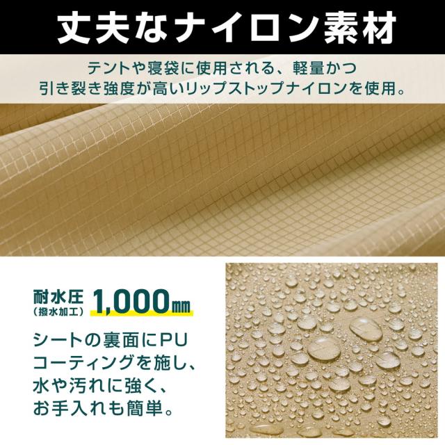 テントや寝袋に使用される、軽量で引き裂き強度が優れたリップストップナイロン素材を使用しています。