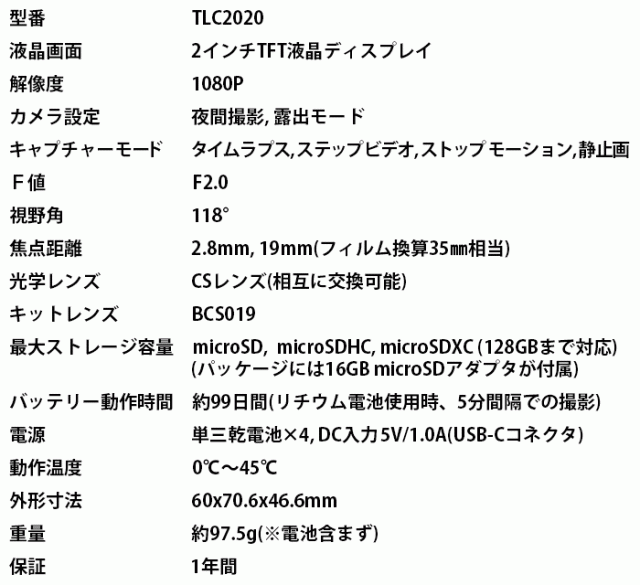 TLC2020は、長寿命バッテリーを搭載した、プロ仕様のタイムラプスカメラです。