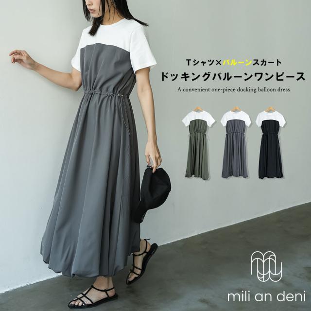 夏新作 ドッキングバルーンワンピース レディース カットソー 半袖 無地 クルー ロング丈 レディース 春夏 ミリアンデニ メール便(郵2) o241077