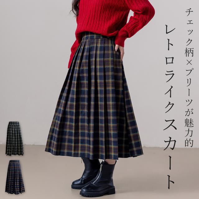 冬新作 「レトロに着映える」チェック プリーツスカート ロング レディース Aライン フレア きれいめ 膝下丈 チェックスカート ボトムス ハイウエスト ワンウェイプリーツ 裏地付き サイドファスナー ベルトループ 通勤 通学 カバーアップ 黒 秋 冬