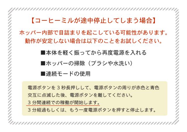 ※動作が途中停止する場合、ホッパー内部で目詰まりの可能性があります。次のことをお試しください。【本体を軽く振って再稼働】【ホッパーの掃除(ブラシや水洗い)】【3分連続モードの使用】=電源パネルの2度目のタップを離さず維持〜数字点滅後に指を離す
