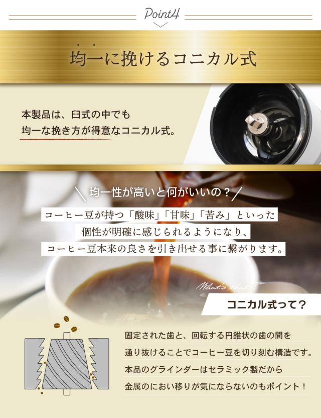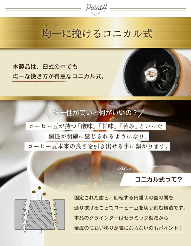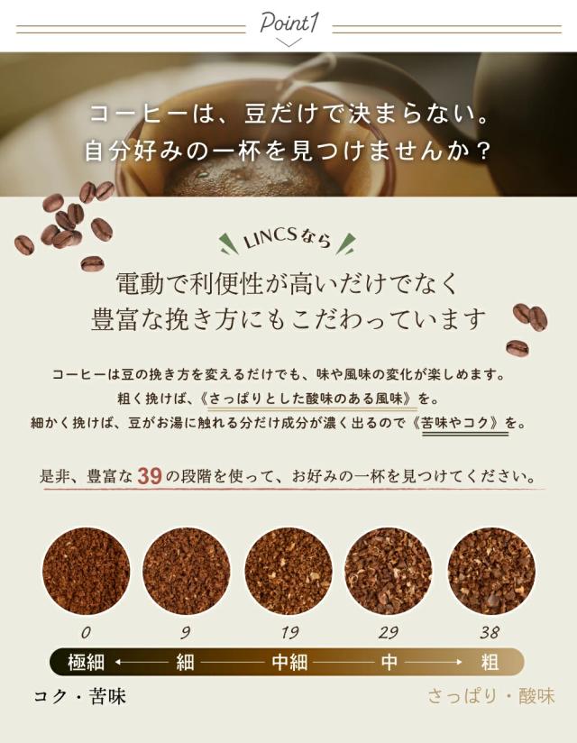 - コーヒー豆をいただいたことをきっかけに初めてコーヒーミルを購入したのですが、この商品を購入して大正解でした。まず、木目調がおしゃれで高級感があり、気分があがります。2人分挽いても時間がかからず、自動で...