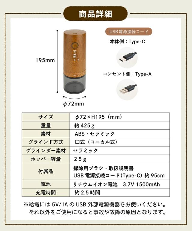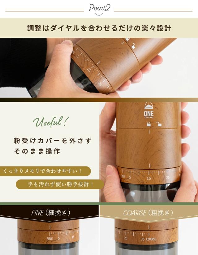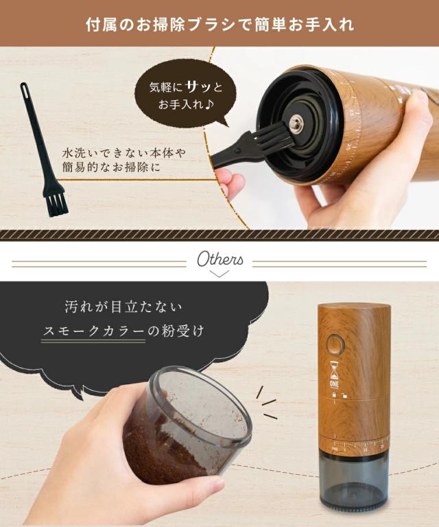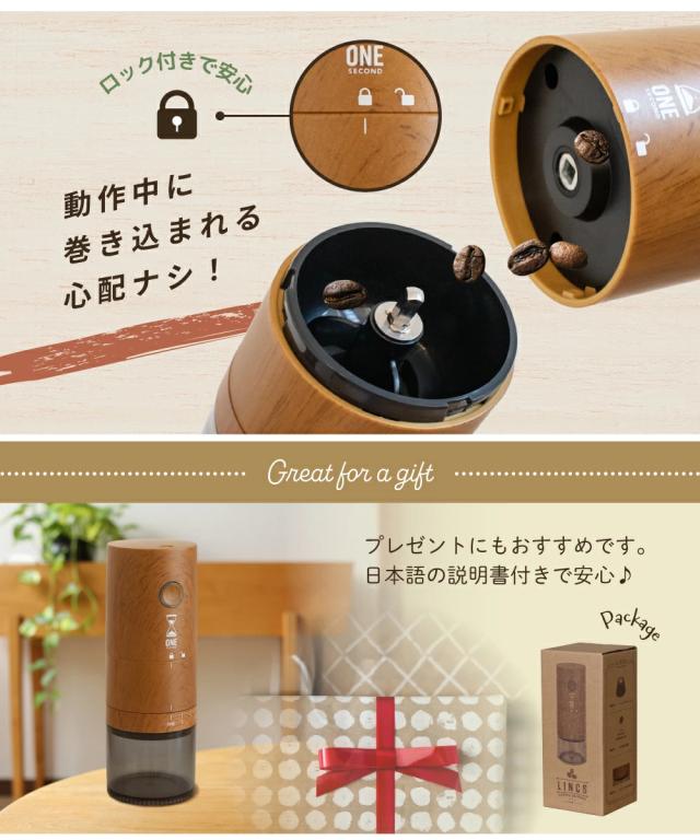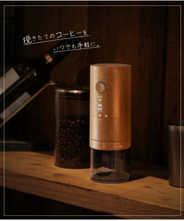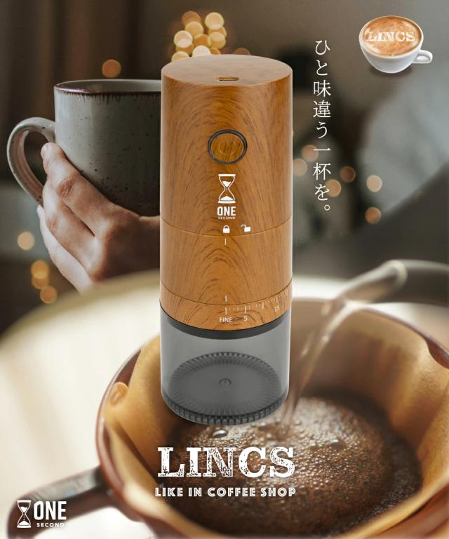 ONE SECOND コーヒーミル 電動 39段階 臼式 コニカル式 セラミック刃 コードレス 洗える 水洗い アウトドア 充電式 コンパクト 自動 おしゃれ 珈琲 粗挽き 細挽き 粒度調整 自動停止 ブラウン 木目 プレゼント ギフト 電動コーヒーミル ワンセカンド LINCS リンクス