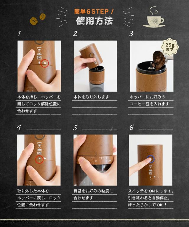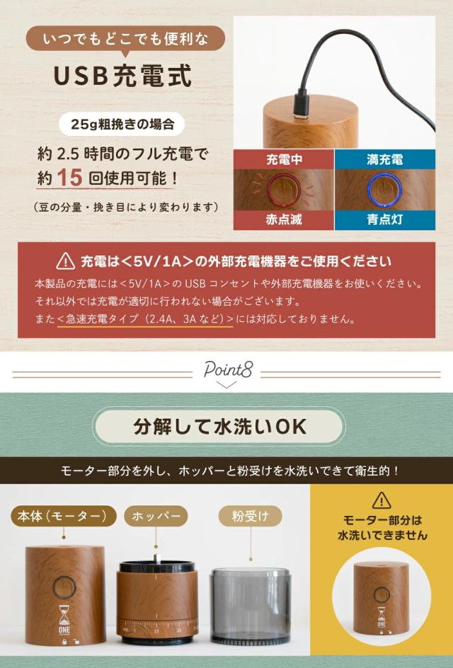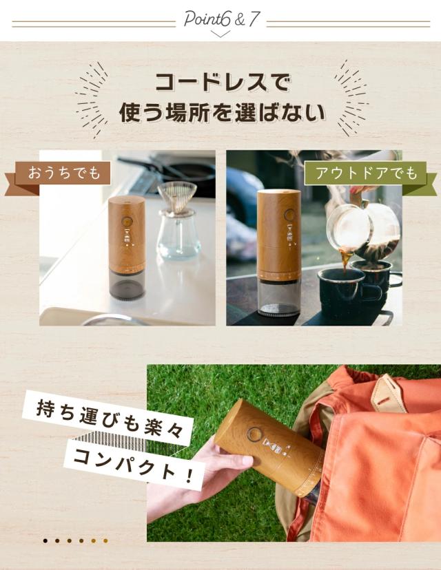 - 充電式なのでコンセントに困らす、サイズもコンパクトなので扱いやすいです。豆挽きが終わると自動OFFでかなりいい感じです。