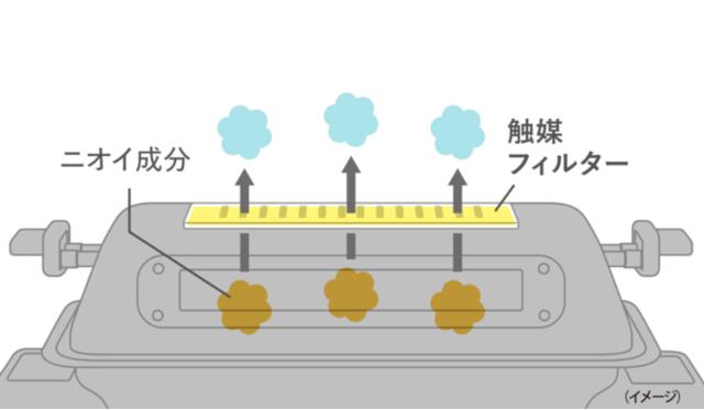 ●高性能触媒フィルターが煙やニオイ成分を分解するので、おうちでのグリル料理に最適です。