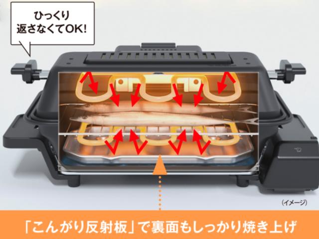 「こんがり反射板」が下ヒーターの熱を反射させ熱効率を高めるとともに、水受皿の水の蒸発量を減らすので、外はパリッと中はふんわり仕上げます。また、上下のヒーターで両面が一度に焼けるから、裏返す手間もありません。
