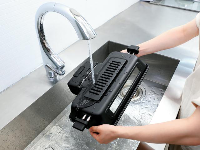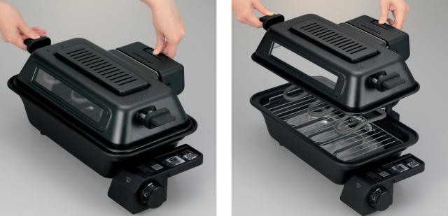 背面上部のプッシュボタンを押しながら引き上げると、簡単にふたが取りはずせます。ふた・ステンレス製焼き網・こんがり反射板・水受皿は分解して丸洗いできるので、手軽にきれいが保てます。