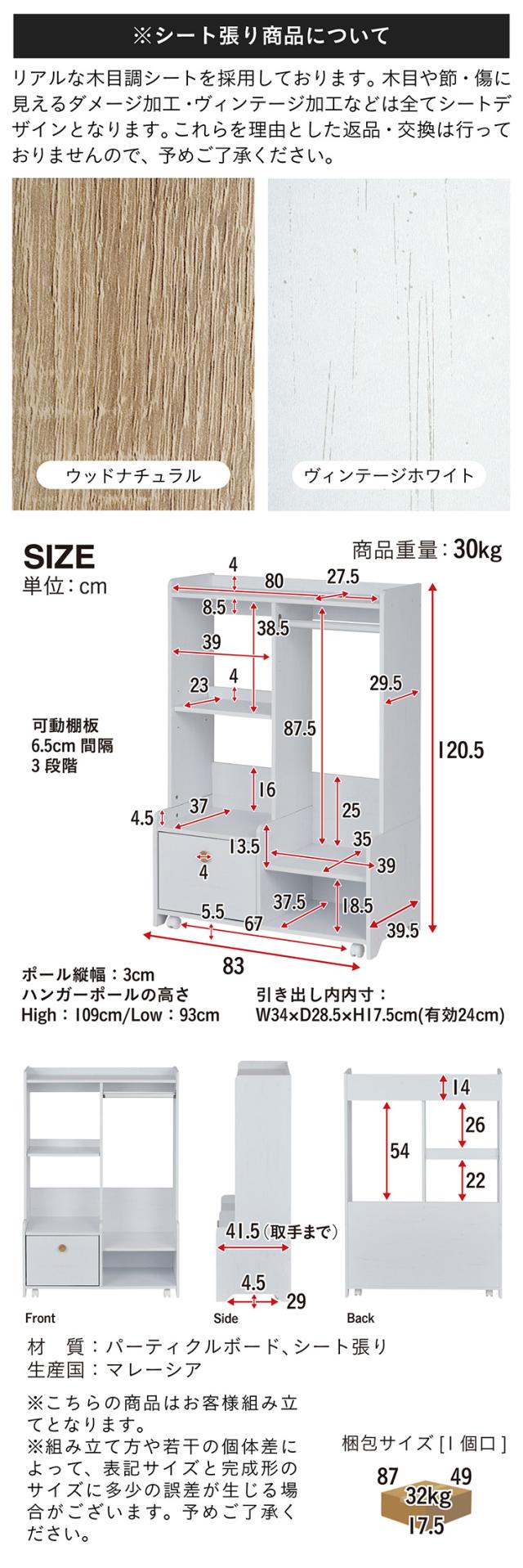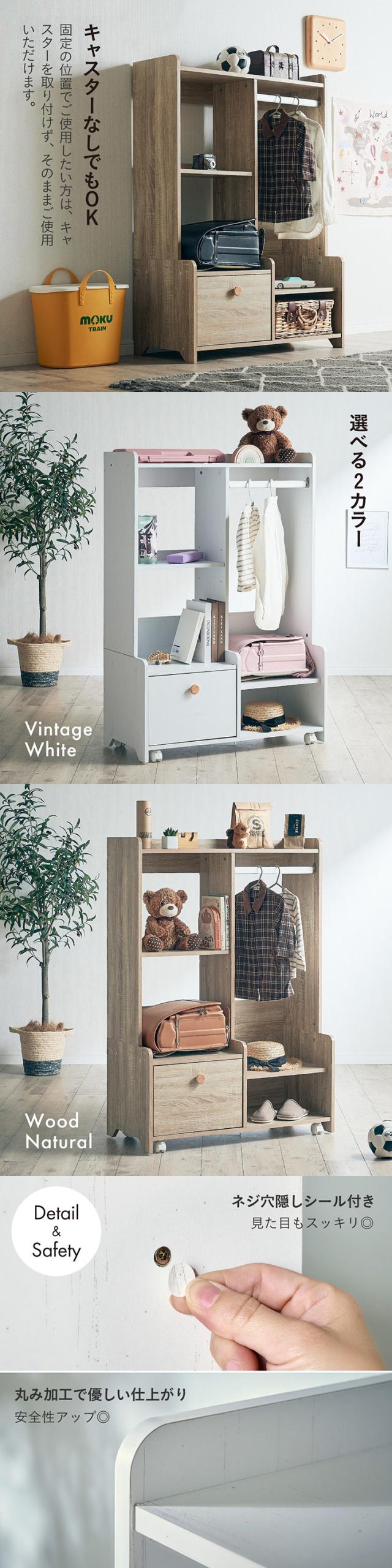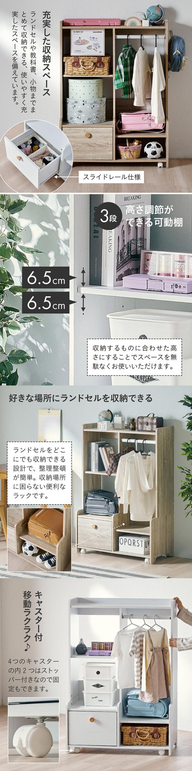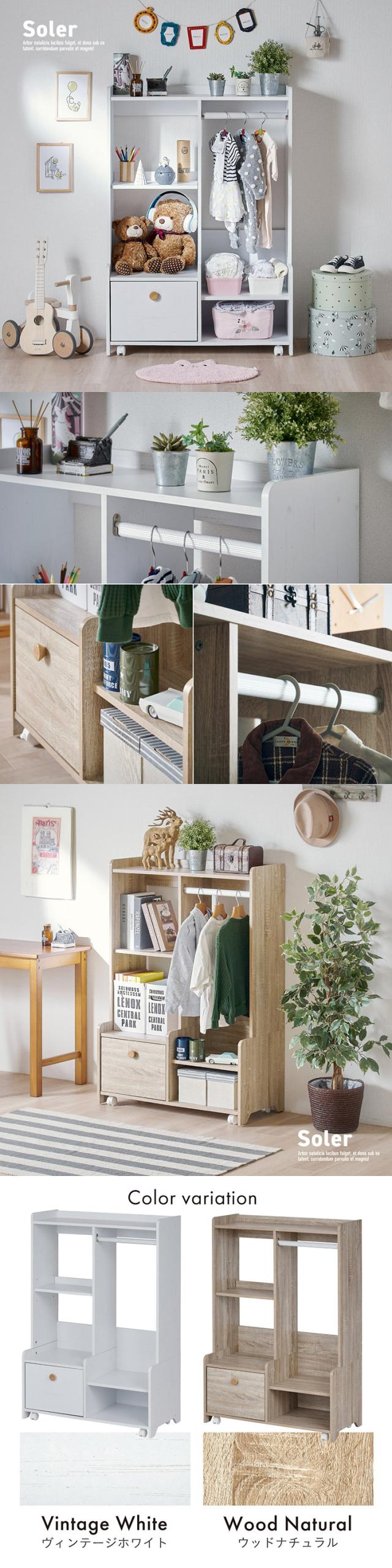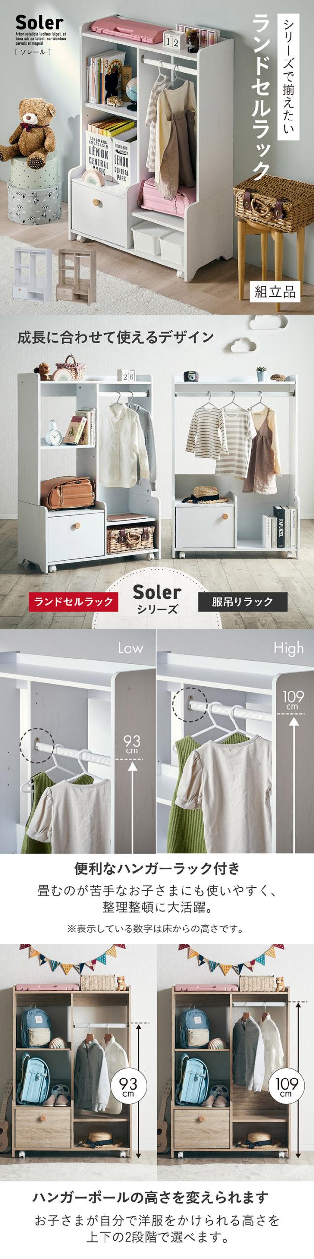 ハンガーラック ランドセルラック スリム おしゃれ 木製 棚付き キャスター付き Soler(ソレール) 2色対応 リビングラック キッズラック ワードローブ 服吊りラック キッズハンガーラック 可動棚 北欧 子供 子供部屋 かわいい