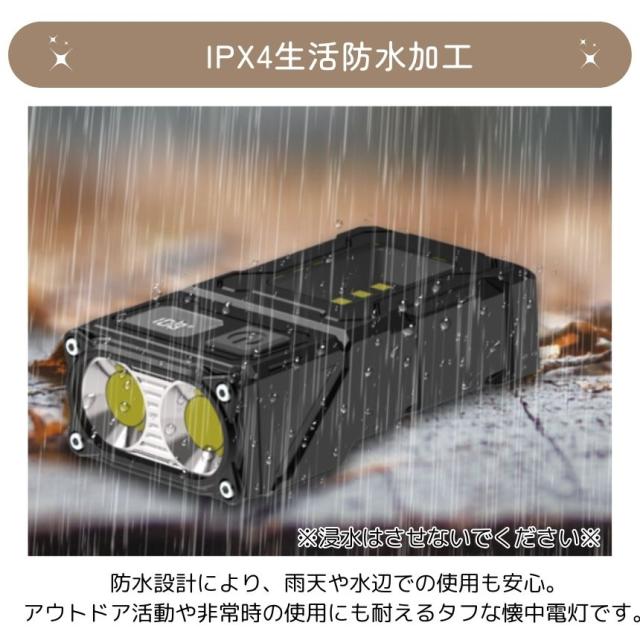 防水設計により、雨や湿気の多い環境でも安心して使用可能です。アウトドアや緊急時の使用を考慮した耐久性を備えています。