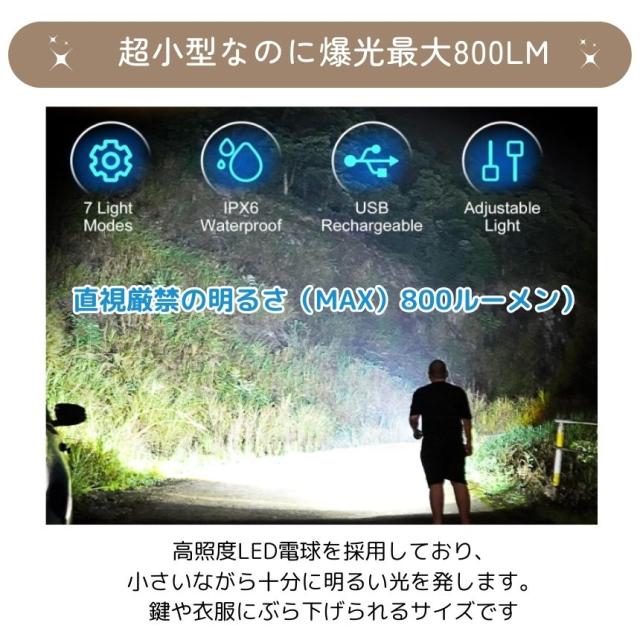 この懐中電灯は、驚くほど小型で軽量ながら、最大800ルーメンの明るさを誇ります。全長約7.3cm、重量わずか約77gとコンパクト設計で、持ち運びに非常に便利です。日常の持ち歩きからアウトドア活動まで、幅広いシーンで活躍します。
