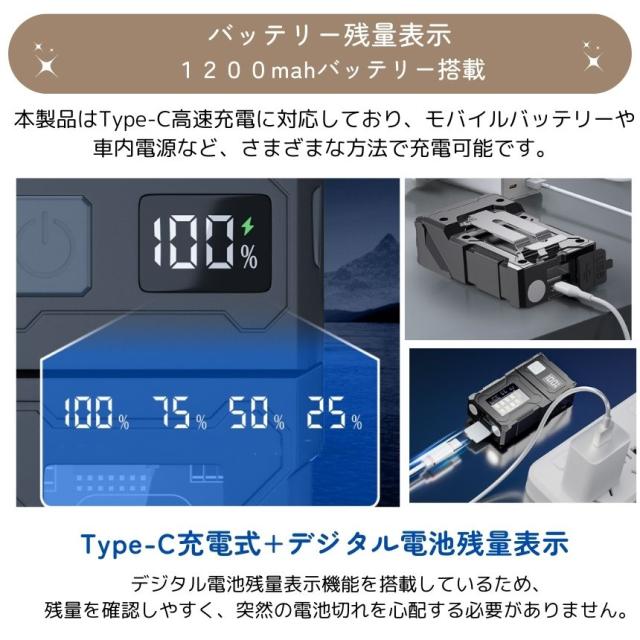 最先端のTYPE-C充電式バッテリーを採用し、効率的な充電が可能です。電池交換の手間が不要で、USB-Cケーブルさえあれば簡単に充電できます。フル充電で長時間の使用が可能なため、緊急時や長時間の作業にも安心です。