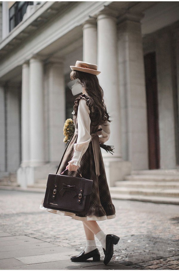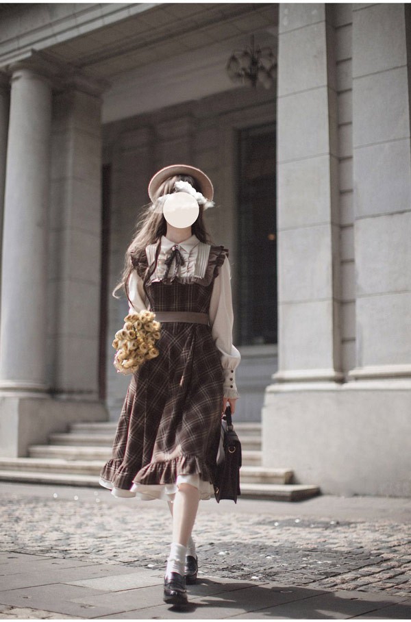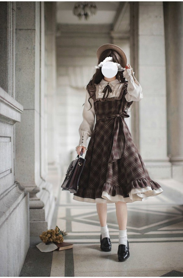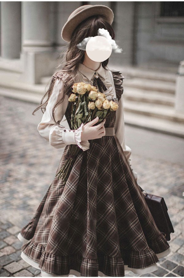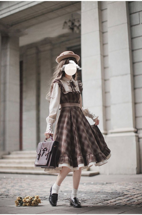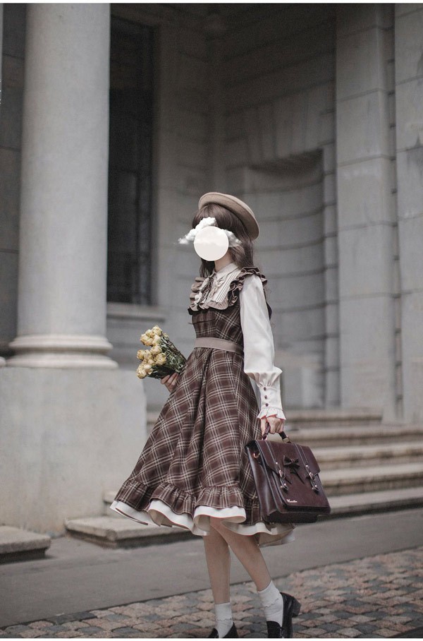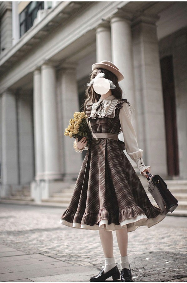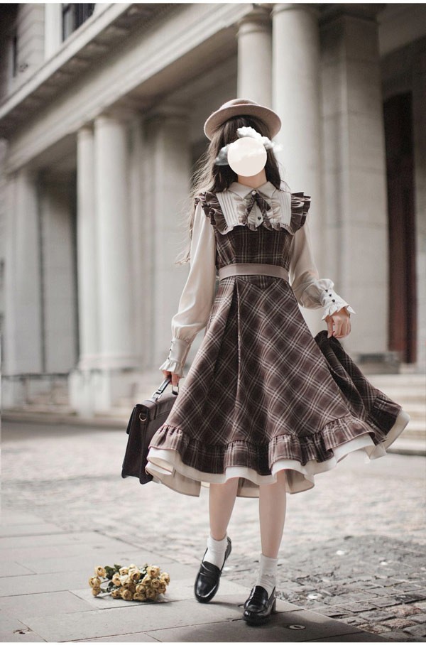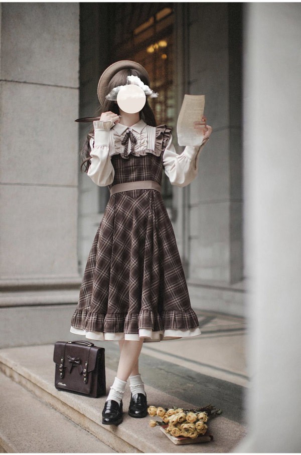 ロリータ ワンピース レトロ風 チェック柄 レディース ロリータワンピース ミモレ丈 学生風 Aライン ハイウエスト ロリィタファッション 森ガール フリル リボン 長袖 ドレス コスチューム 衣装 かわいい 日常着 通学 通勤 お出かけ 仮装 パーティ イベント 大きいサイズ ブラウン S M L XL da688m4m4x7 da688m4