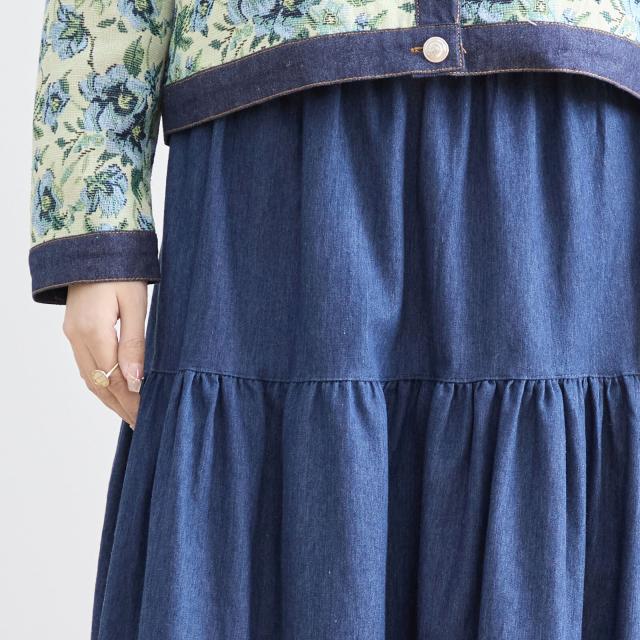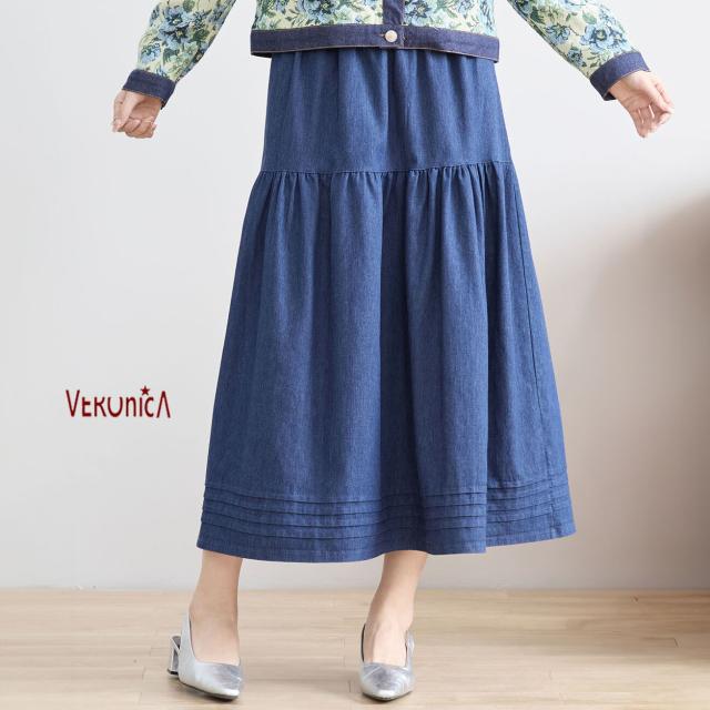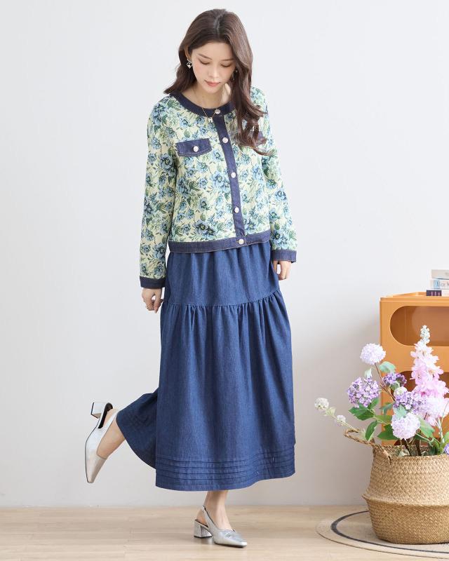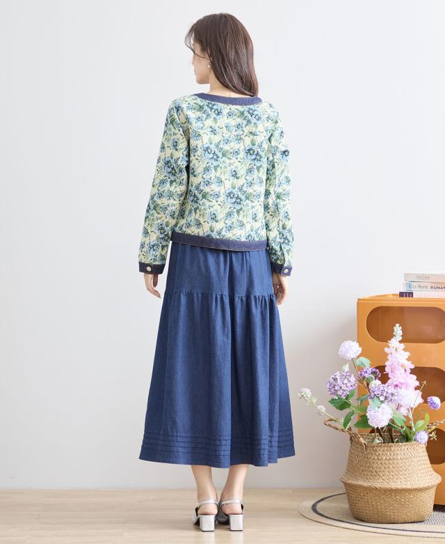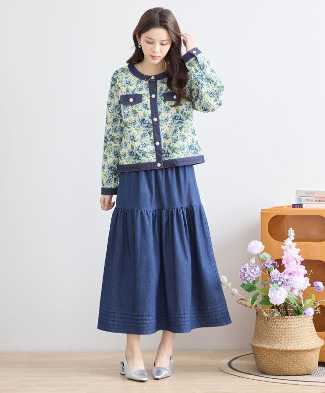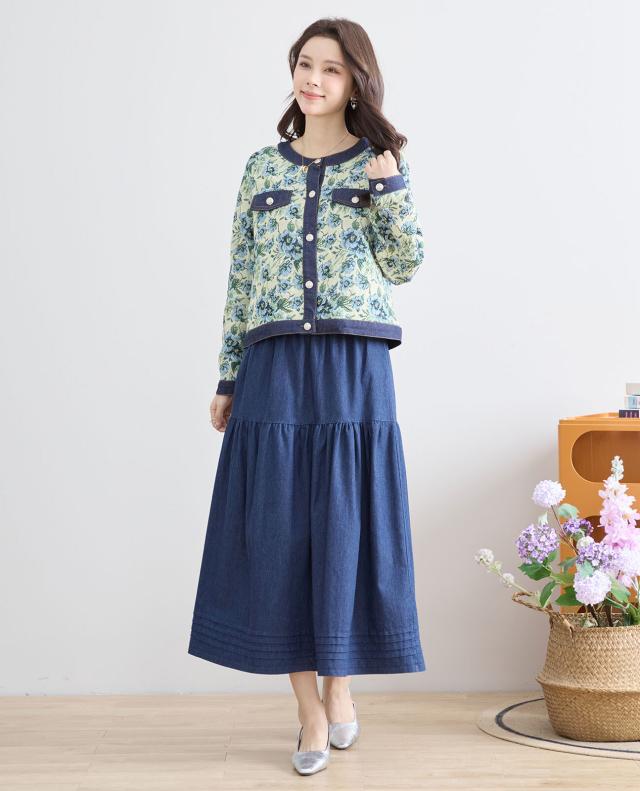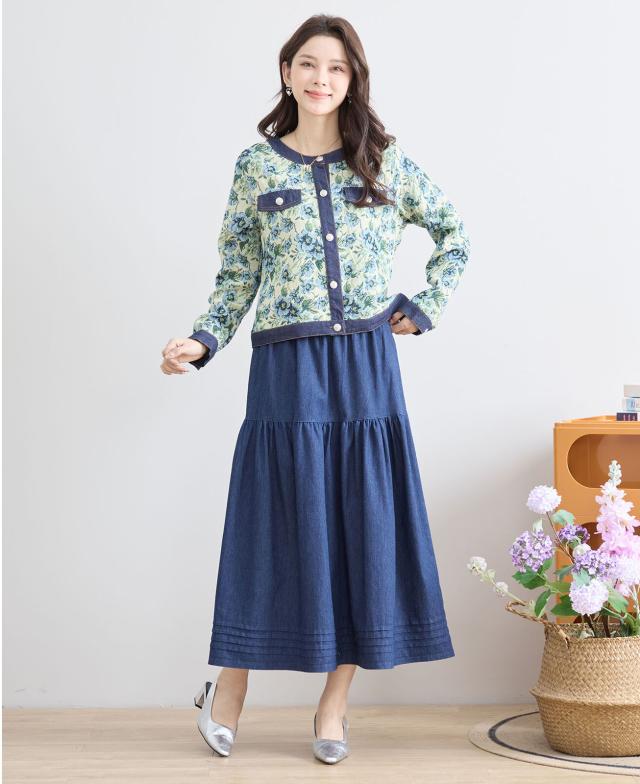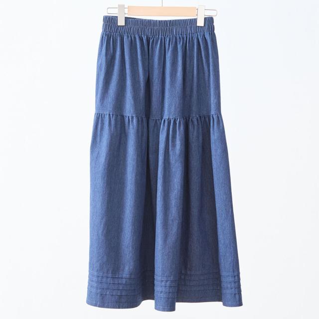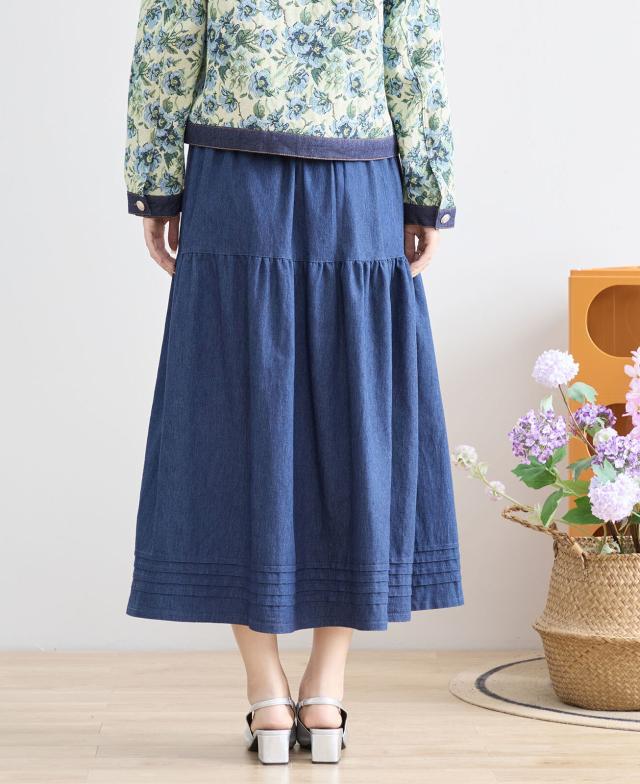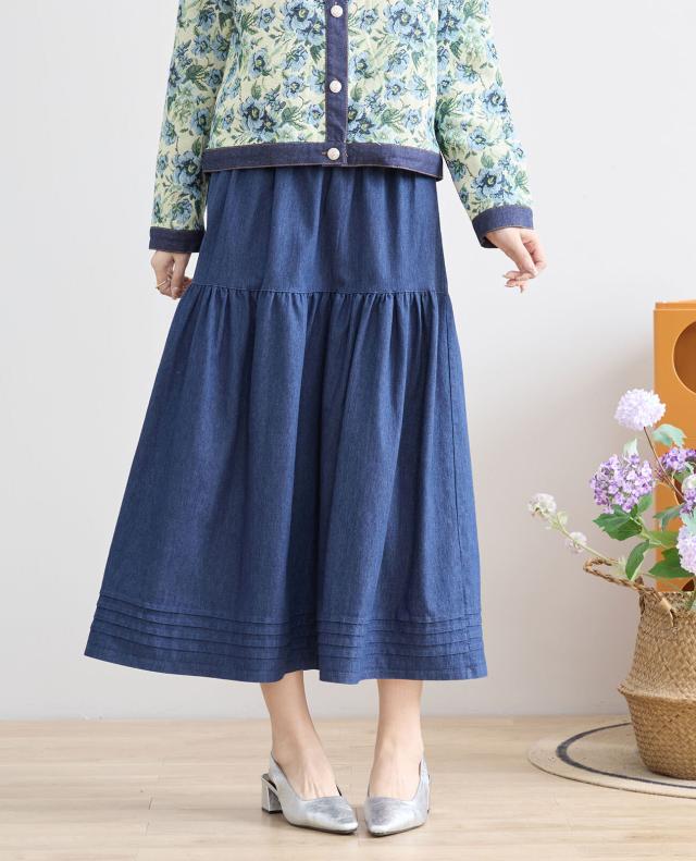 【即納】フェミニンデニムフレアスカート 膝下丈 ウエストゴム 体型カバー ボトムス 春夏 新作