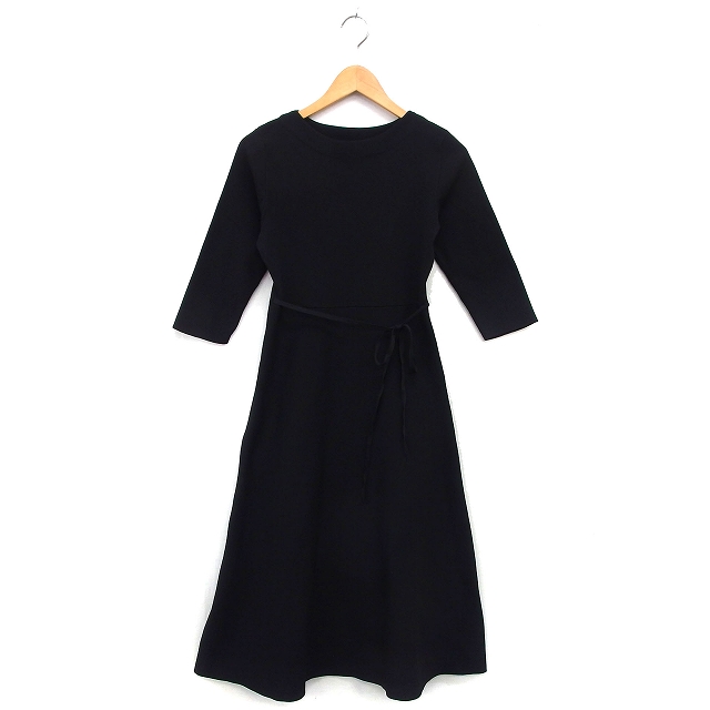 【中古】ナチュラルクチュール natural couture フレア ワンピース マキシ丈 リブ リボン ボートネック 無地 長袖 F