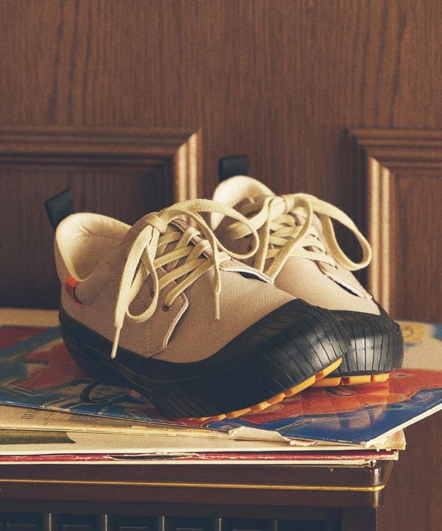 目の粗い撥水リサイクルポリエステルを使用。急な雨や水たまりなどの足元が悪い場面でもご着用いただけます。(接地面から4cm・6時間防水)