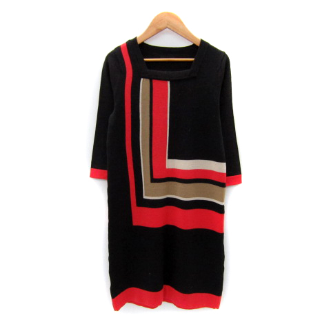 【中古】iCB ニットワンピース ひざ丈 七分袖 スクエアネック マルチカラー S ダークブラウン 赤 レディース