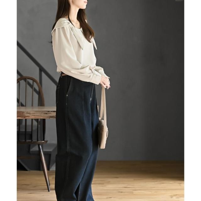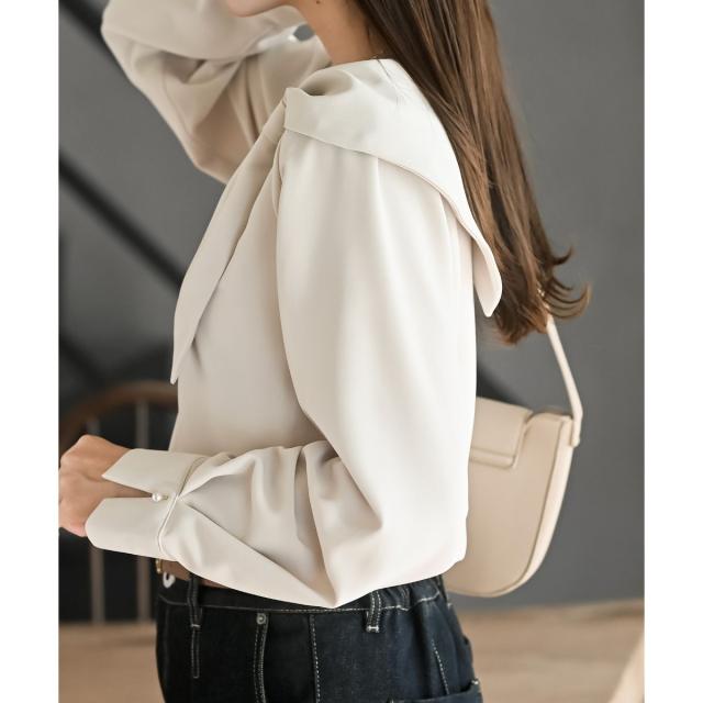 リボンのような襟が付いたフェミニンなブラウス。